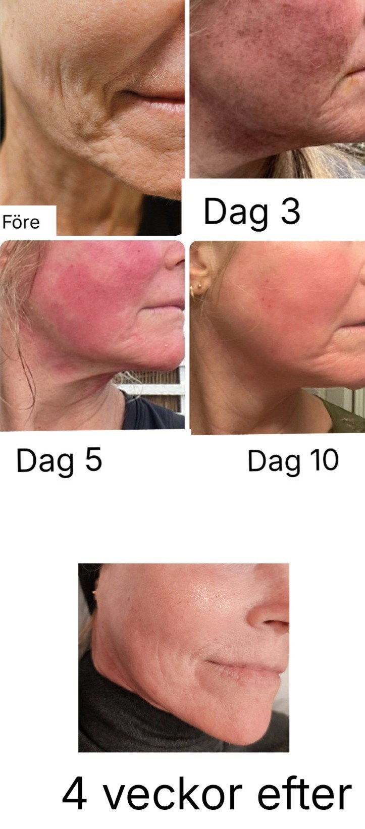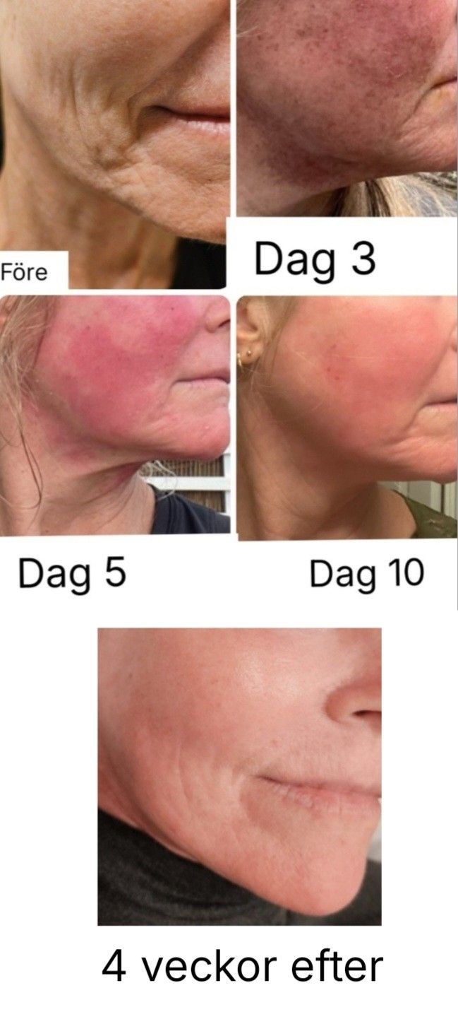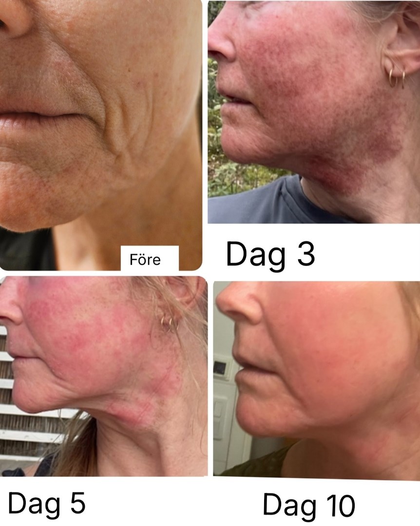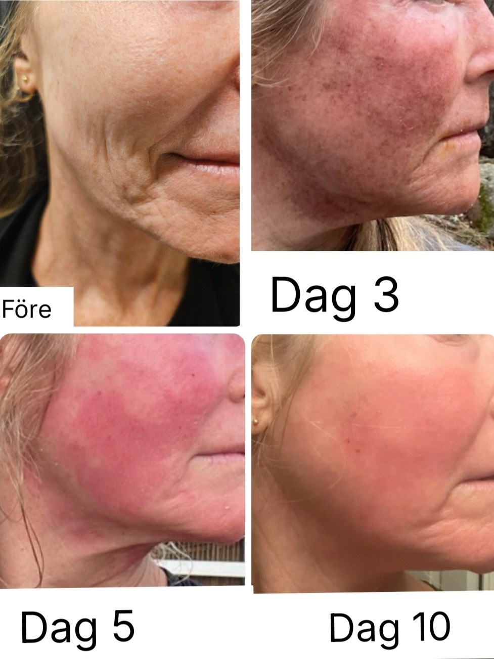 Man upplever att huden känns svullen och kraftigt solbränd. Den intensivaste värmen försvinner efter ca 2-3 timmar. Rodnad och svullnad varierar beroende på hudstruktur och vad som ska behandlas. Huden kommer att ha en rödaktig ton 5-7 dagar efter behandling, Svullnaden kan i värsta fall hålla i sig i upp till 3 dagar! Detta är helt normalt och ett tecken på att vävnaden i läderhuden läker. Vid kraftfulla behandlingar är återhämtningen ca 5-7 dagar, vid mildare behandlingar är återhämtningen ca 3 dagar.