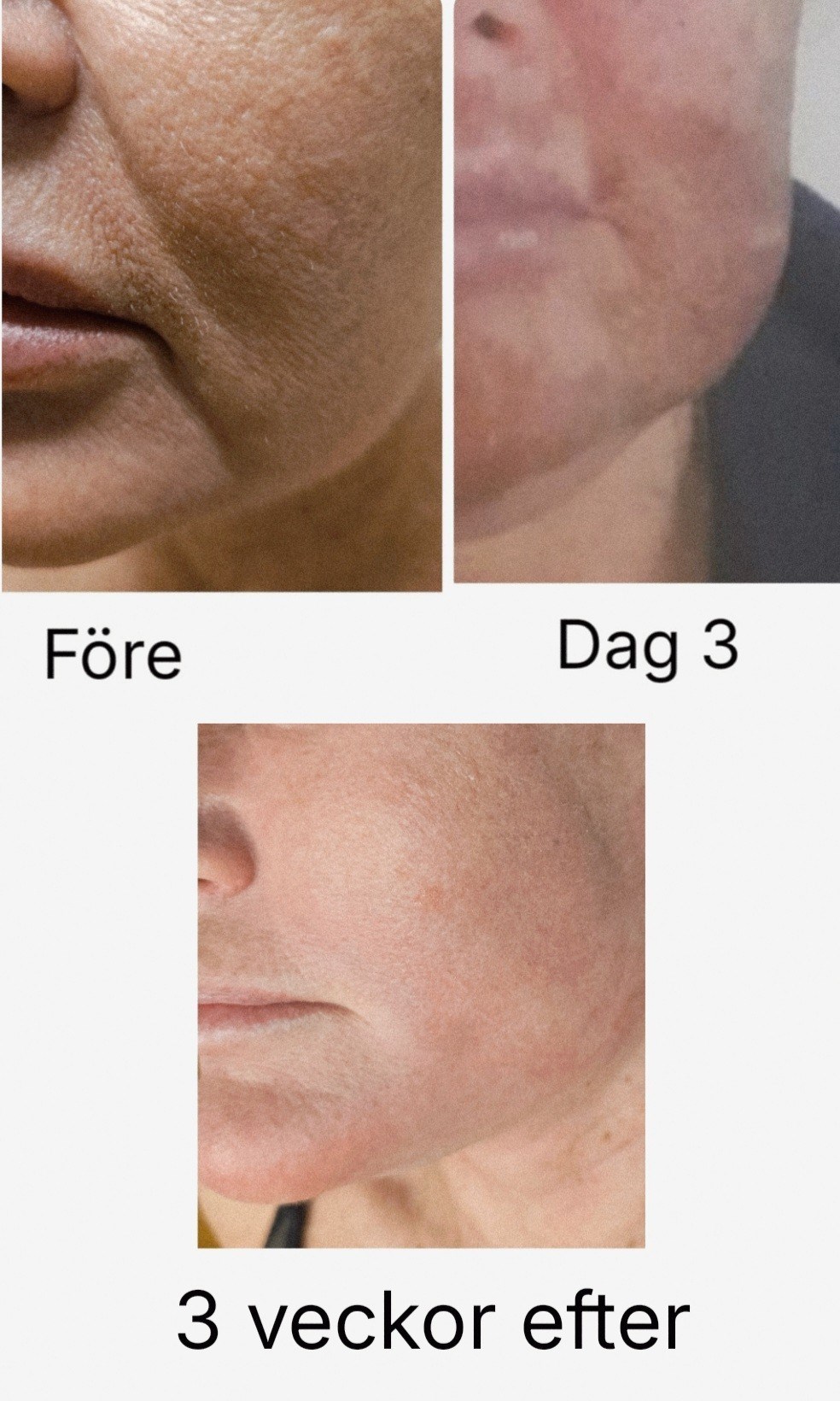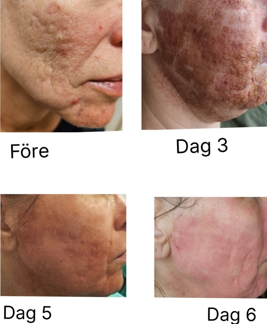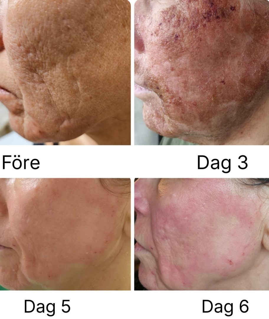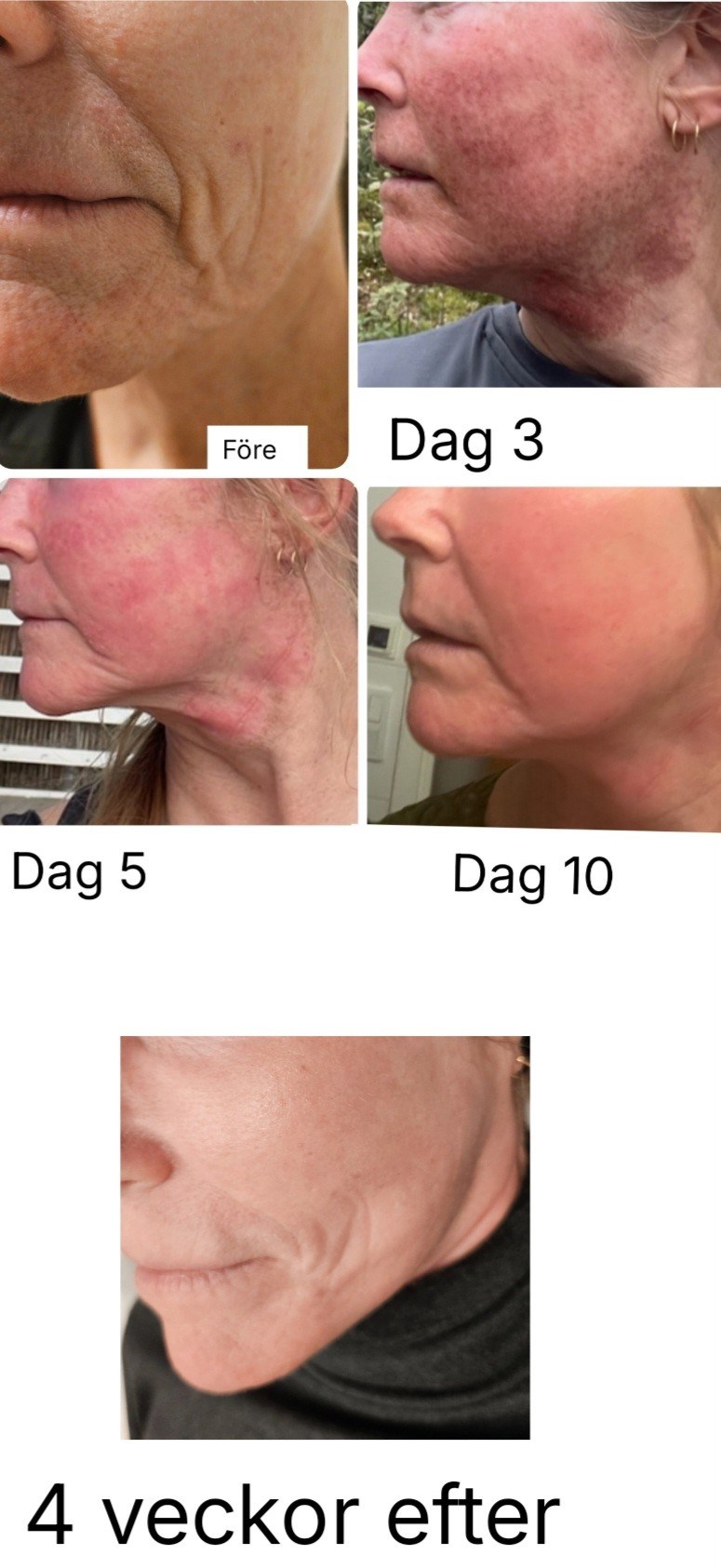 Man upplever att huden känns svullen och kraftigt solbränd. Den intensivaste värmen försvinner efter ca 2-3 timmar. Rodnad och svullnad varierar beroende på hudstruktur och vad som ska behandlas. Huden kommer att ha en rödaktig ton 5-7 dagar efter behandling, Svullnaden kan i värsta fall hålla i sig i upp till 3 dagar! Detta är helt normalt och ett tecken på att vävnaden i läderhuden läker. Vid kraftfulla behandlingar är återhämtningen ca 5-7 dagar, vid mildare behandlingar är återhämtningen ca 3 dagar.