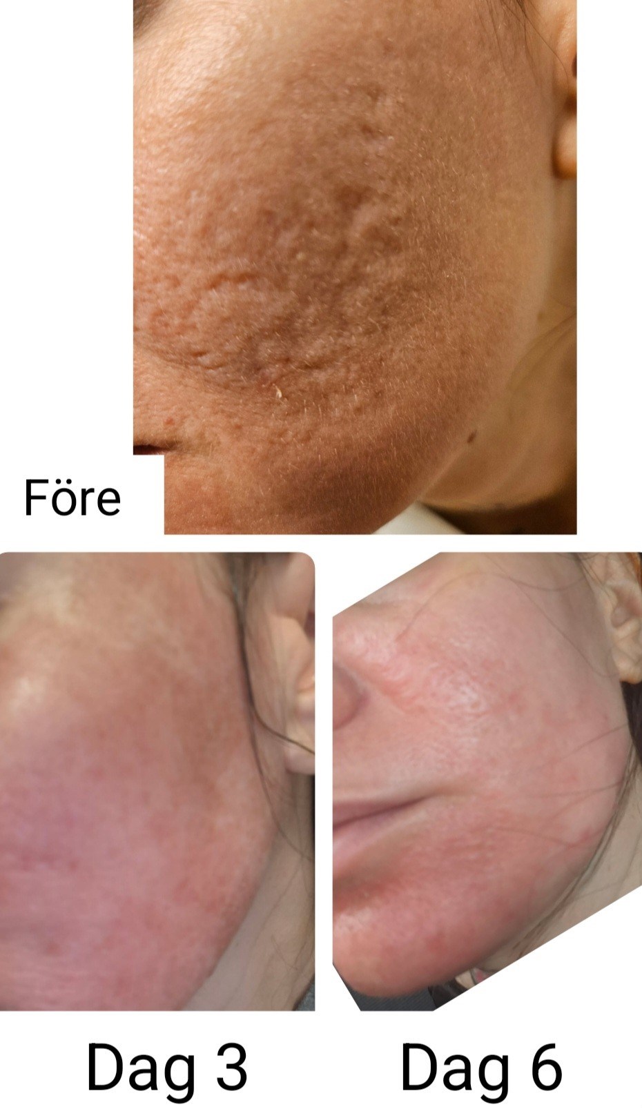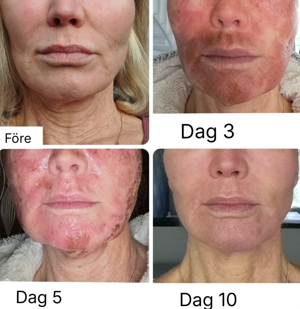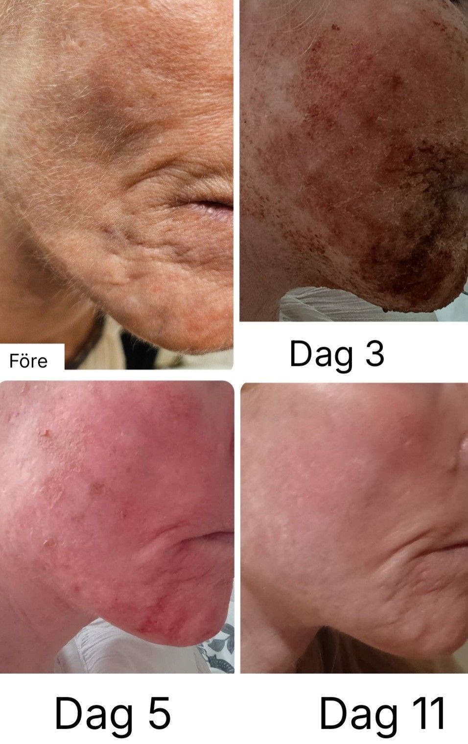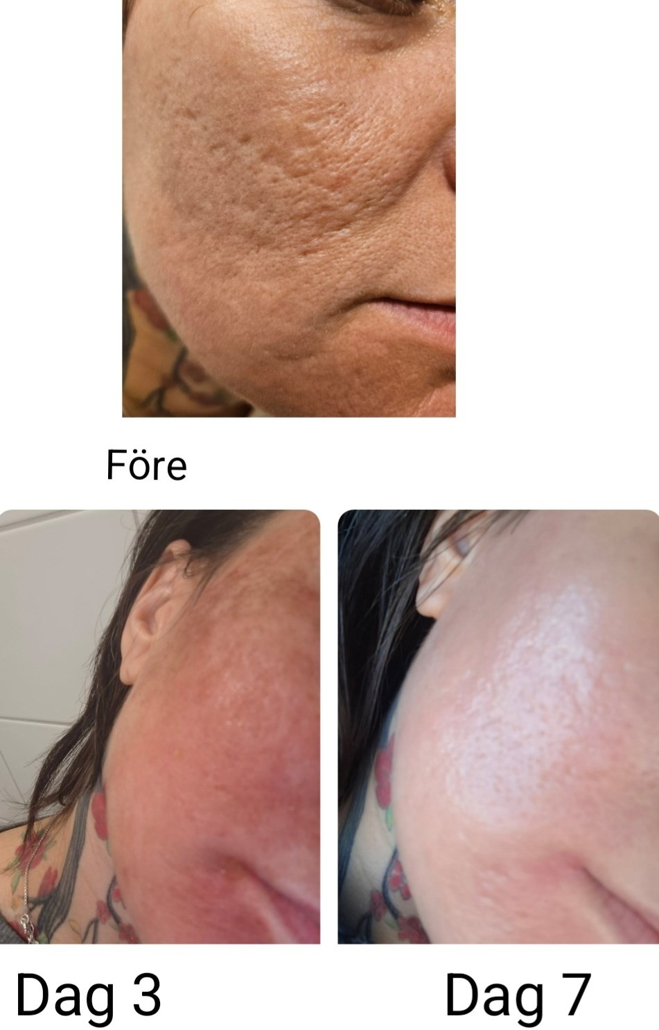 Man upplever att huden känns svullen och kraftigt solbränd. Den intensivaste värmen försvinner efter ca 2-3 timmar. Rodnad och svullnad varierar beroende på hudstruktur och vad som ska behandlas. Huden kommer att ha en rödaktig ton 5-7 dagar efter behandling, Svullnaden kan i värsta fall hålla i sig i upp till 3 dagar! Detta är helt normalt och ett tecken på att vävnaden i läderhuden läker. Vid kraftfulla behandlingar är återhämtningen ca 5-7 dagar, vid mildare behandlingar är återhämtningen ca 3 dagar.