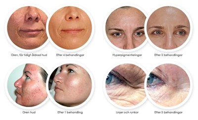 Rynkor ,solfläckar ,fina linjer ,slapp hud ,ärr ,ojämn hudstruktur ,trött, grå och matt hud ,pigmentfläckar,förstorade porer ,hudbristningar (striae distensae), melasma